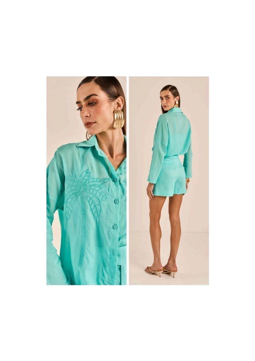 A camisa Acácia, com seus bordados artesanais de palmeiras, traz um visual natural, exclusivo e extremamente elegante. Seu caimento soltinho valoriza qualquer tipo de corpo, oferecendo fluidez e liberdade de movimento.