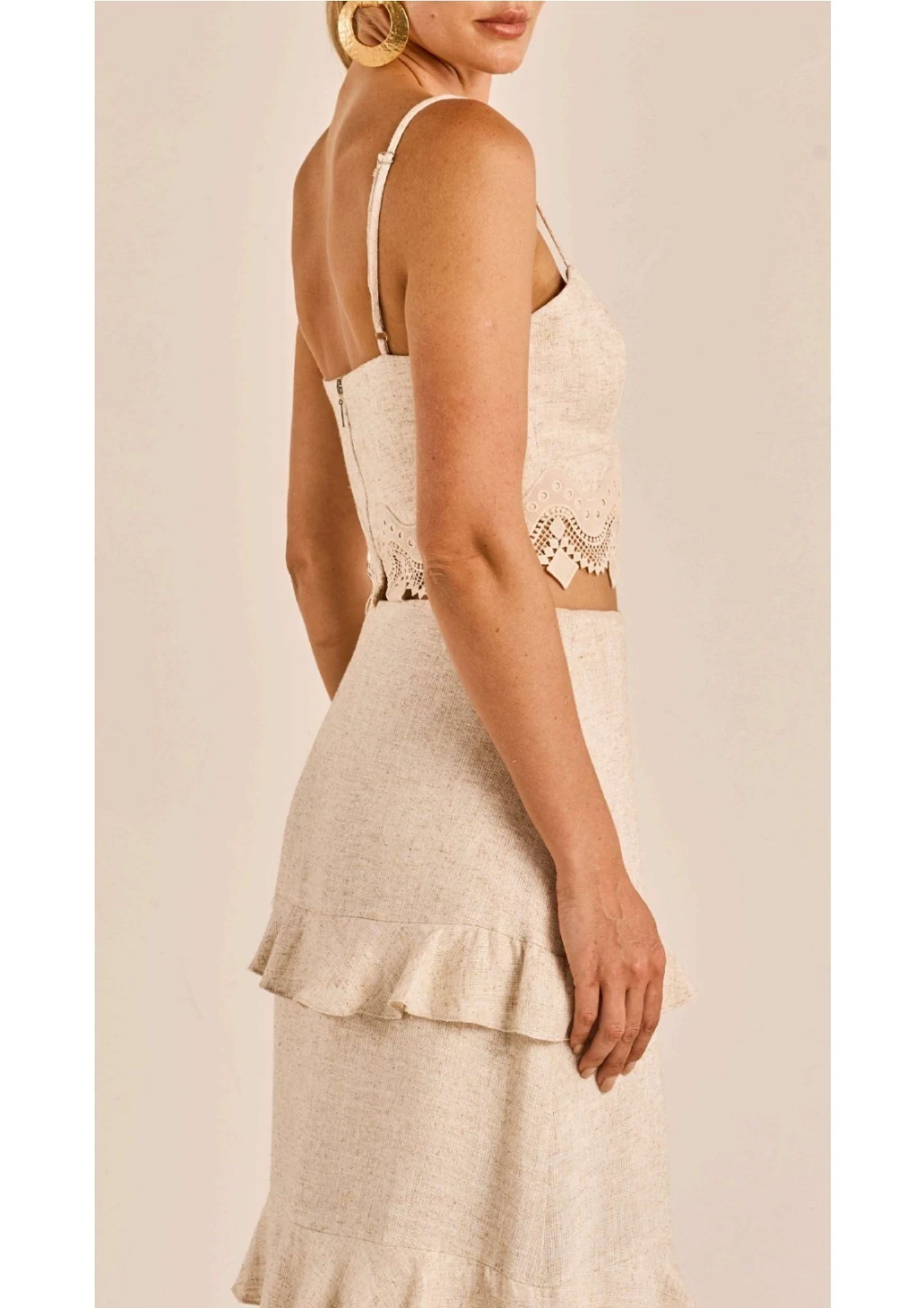 Conjunto Carminda, a escolha perfeita para quem busca delicadeza, frescor e um toque de romantismo contemporâneo. O top possui alças finas, recorte frontal e aplicação rendada na barra, criando um visual feminino e sofisticado com caimento impecável.