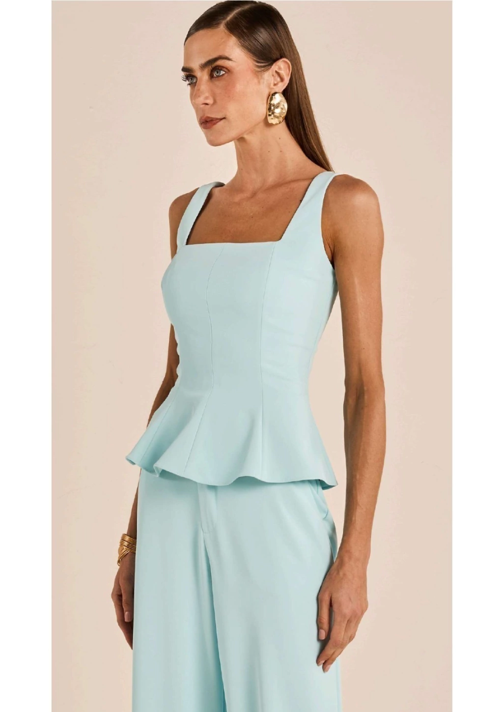 A Blusa apresenta decote quadrado e alças largas que valorizam o colo com elegância. O peplum sutil define a cintura de forma delicada, trazendo equilíbrio entre estrutura e leveza. Seu caimento ajustado realça a silhueta sem perder o conforto, adicionando charme e presença ao look.